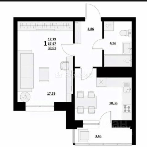 РАЦИОНАЛЬНАЯ ПЛАНИРОВКА квартиры, представляет собой просторную комнату (17,5 кв. м.) с выходом на балкон, уютную кухню (6 кв. м.), коридор, где организована вместительная гардеробная, раздельную ванную комнату и санузел.