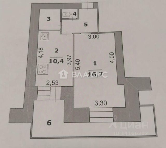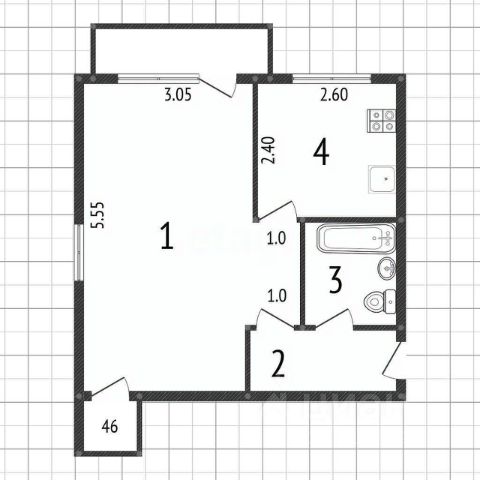 Площадь: 43,9 м² (комната 20 м² + кухня 10 м²)