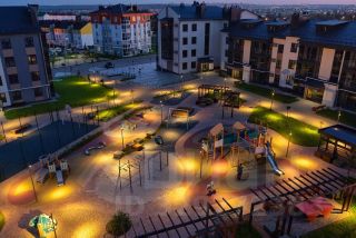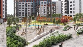 Благоустроенный зеленый двор с детскими площадками и зонами отдыха, открытая наземная парковка.