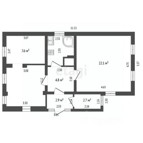 Общая площадь дома — 150 кв. м, жилая — 66,1 кв. м. В доме четыре комнаты, площадь которых составляет 21,4 кв. м, 12,2 кв. м, 16,1 кв. м и 16,4 кв. м, а также просторная кухня площадью 22,3 кв. м. Есть зона отдыха, сад огород, вольер для собаки и хоз. постройка для хранения инвентаря.