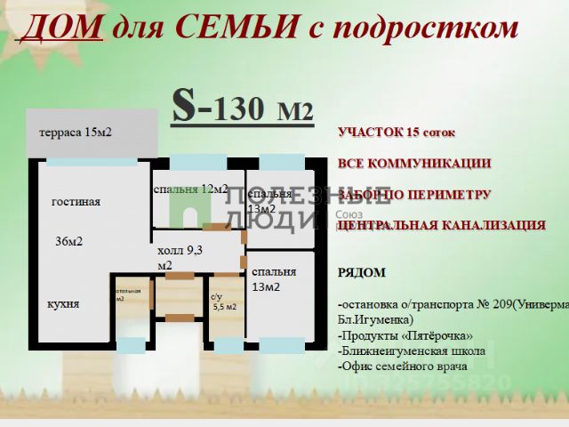 ДОМ ДЛЯ СЕМЬИ С ПОДРОСТКОМ на УЧАСТКЕ 15 соток ВСЕ КОММУНИКАЦИИ ЗАБОР ПО ПЕРИМЕТРУ __________________________________________ Новый дом , введён в эксплуатацию Строили для себя Электричество, вода -в доме Газ до участка Центральная канализация Забор с 3х строн Поставлены и забетонированы столбы по фасадный забор Выполнена отмостка КУХНЯ-ГОСТИНАЯ 36 М2 Выделена рабочая зона, Кухня-10м2 Гостиная 26 м2 3 СПАЛЬНИ 12; 12, 6; 12, 9 м2- подходят под разный функционал по Вашему усмотрению (детская(ие)/спальня для родителей/гостевая/кабинет) КОТЕЛЬНАЯ 5м2 САНУЗЕЛ 5, 5 м2 ХОЛЛ 9м2 ПРИХОЖАЯ 3 м2 ТЕРРАСА 15 М2 ТЕХНОЛОГИЯ -фундамент ленточный армированный -наружные стены - керамзитобетонный блок -крыша металлочерепица -выполнена отмостка - РЕМОНТ -выполнен: разводка воды и электричества -окна ПВХ 2х камерные -проведены тёплые полы УЧАСТОК 15 соток -посажен молодой сад РЯДОМ -остановка о/транспорта 209(Универмаг-Бл. Игуменка)-2 мин -Продукты "Пятёрочка"- 6 мин -Ближнеигуменская школа -8 мин -Офис семейного врача- 8 мин _____________________________________________ Один взрослый собственник Документы готовы ПОДХОДИТ под сельскую, обычную ИПОТЕКИ, СЕРТИФИКАТЫ, СУБСИДИИ, С/СЧЁТ Помогу в одобрении ипотеки с любой кредитной историей. _________________________________________________ ___ Просмотр по предварительной договорённости - звоните. Юридическое сопровождение сделки. Арт. 128594001