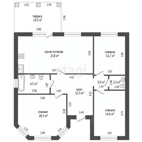 Общая площадь дома — 150 кв. м, жилая — 66,1 кв. м. В доме четыре комнаты, площадь которых составляет 21,4 кв. м, 12,2 кв. м, 16,1 кв. м и 16,4 кв. м, а также просторная кухня площадью 22,3 кв. м. Есть зона отдыха, сад огород, вольер для собаки и хоз. постройка для хранения инвентаря.