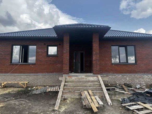 Дом построен из блока Аэробел, толщина 40 см, облицован красным кирпичом.