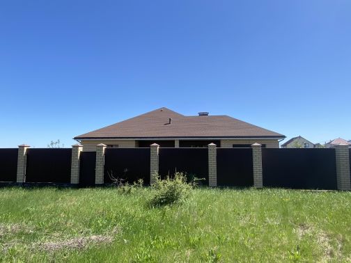 Двухэтажный кирпичный дом, утеплен 10-см. утеплителем, покрыт короедом. Утопает в зелени. В двухстах метрах небольшой дубовый лес.