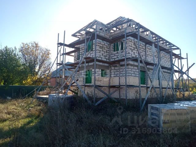 Выполнен из газосиликатного блока, обложен кирпичом, крыша шиферная, окна пластиковые, общей площадью 180 кв.м., на земельном участке 15соток .