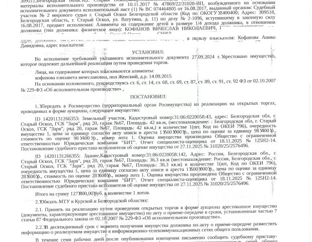 Данные получены с сайта ГИС Торги. Нежилое здание площадью 36,3 кв. м, кадастровый номер 31:06:0220058:142. Земельный участок площадью 42 кв. м, кадастровый номер 31:06:0220058:43. Имущество обременено: арест, запрещение регистрации. Имущество принадлежит на праве собственности Кофанову В.Н. Основание реализации: постановление о передаче арестованного имущества на торги от 16.12.2025 31020/25/2719863 Старооскольского РОСП