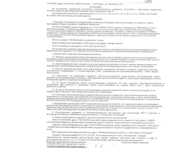 Данные получены с сайта ГИС Торги. Жилое помещение площадью 29.7 кв. м, кадастровый номер 31:10:1003001:1802. Имущество обременено: арест, запрещение регистрации. Имущество принадлежит на праве собственности Лавреевой Л.В. Основание реализации: постановление о передаче арестованного имущества на торги от 28.08.2025 31010/25/994648 ОСП по г.Белгороду