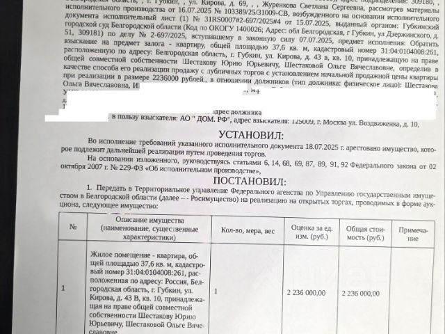 Данные получены с сайта ГИС Торги. Имущество обременено: арест, запрещение регистрации, ипотека. Первичные торги. Адрес: Белгородская обл., г. Губкин, ул. Кирова, д. 43в, кв. 10. Собственник: Шестаков Ю.Ю., Шестакова О.В. Залогодержатель: ПАО "Сбербанк". Взыскатель: АО "ДОМ. РФ". Основание реализации исполнительный лист: Губкинский городской суд 2-697/2025 от 14.05.2025 Судебный пристав Журенкова С.С., Губкинское РОСП, тел. 8 (47241) 2-05-56, 8 (47241) 2-13-74, 8 (980) 378-33-03