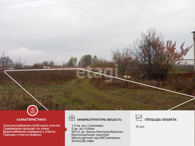 Продается земельный участок в с. Сергиевка, Губкинский район, Белгородская область. Ищете идеальное место для строительства вашего нового дома? Продается ровный земельный участок в с. Сергиевка, который станет отличным выбором для индивидуального жилищного строительства (ИЖС). Можем обсудить небольшой торг. Особенности участка: Площадь и размер: Участок не огорожен, с шириной 30 метров, что предоставляет возможности для планирования и постройки. Коммуникации: Газ, свет и вода проходят по улице.На границе участка находится колодец с водой, что является дополнительным преимуществом. Асфальтированная дорога: Удобный доступ к участку благодаря хорошей дорожной инфраструктуре. Тихое и живописное место: Улица с новыми постройками создает комфортную атмосферу для жизни. Межевание: Проведено, что упрощает процесс дальнейшего оформления. Документы: Один собственник, все необходимые документы готовы к продаже. Дополнительные услуги: Мы оказываем помощь в одобрении и оформлении ипотеки, а также можем предложить проверенных подрядчиков, с которыми строительство вашего дома мечты будет быстрое и комфортное. Звоните для получения дополнительной информации! Код пользователя: 151669 Номер в базе: 7267914