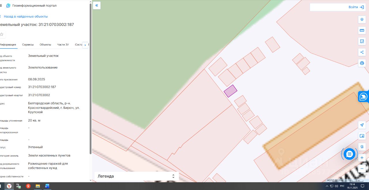 Земельный участок с кадастровым номером 31:21:0703002:187, общей площадью 20 кв. м. расположенный по адресу: Белгородская область, р-н Красногвардейский, г. Бирюч, ул. Крупской