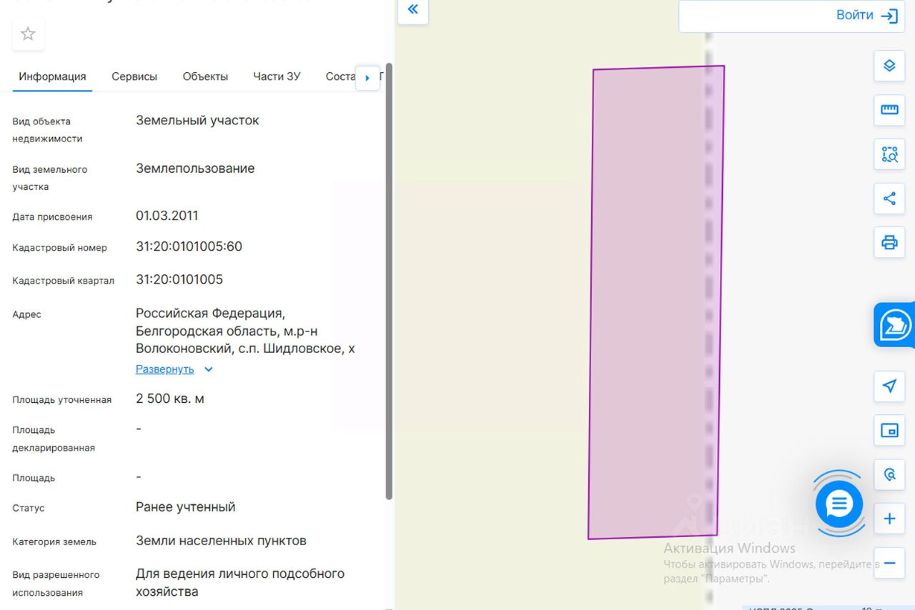 земельный участок из земель населенных пунктов с кадастровым номером 31:20:0101005:60, площадью 2500 кв.м, расположенный по адресу: Белгородская область, Волоконовский район, х. Одинцов, разрешенное использование для ведения личного подсобного хозяйства