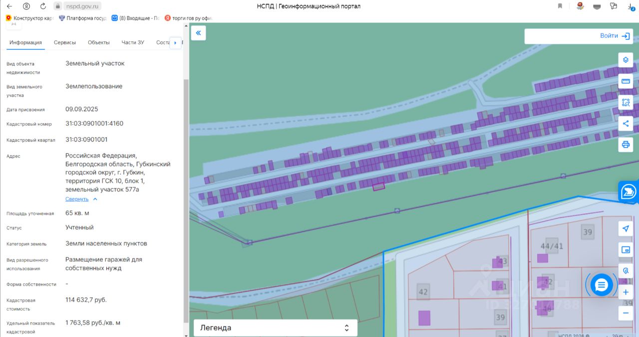 земельный участок площадью 65 кв.м с кадастровым номером 31:03:0901001:4160 (земли населенных пунктов), расположенный по адресу: Российская Федерация, Белгородская область, Губкинский городской округ, г. Губкин, территория ГСК 10, блок 1, земельный участок 577а, с видом разрешенного использования "размещение гаражей для собственных нужд"