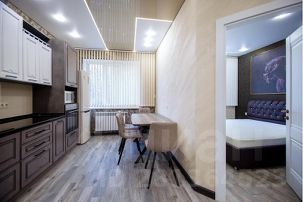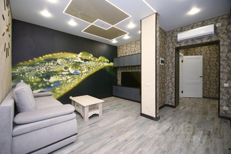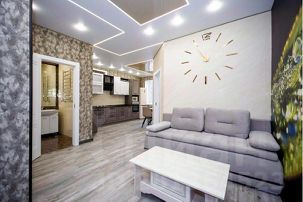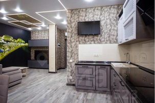 Апартаменты полу-студийной планировки: территория кухни объединена с гостиной и прихожей в единое свободное пространство, изолированная спальня и просторный совмещенный санузел.