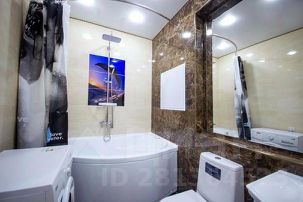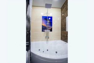 Угловая ванна с джакузи, тропический душ, гигиенический душ, панорамное зеркало в ванной комнате.