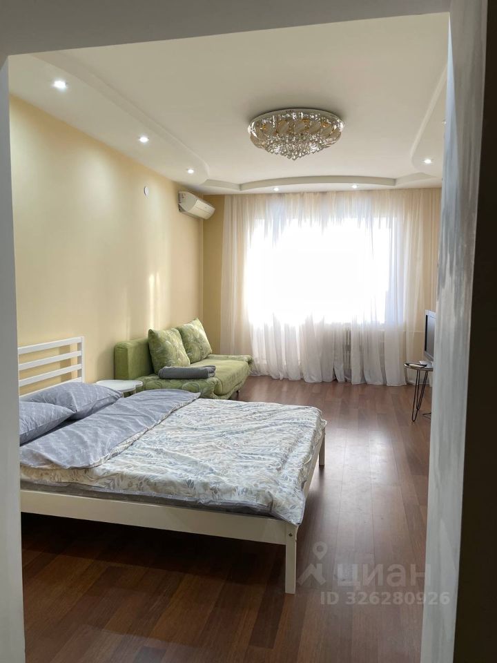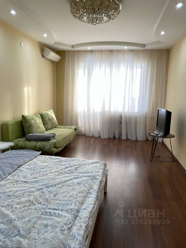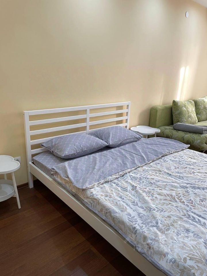 Сдается 1-к квартира (одна изолированная комната и просторная кухня). В комнате находится кровать и раскладной диван, т.е. 4 спальных места, а также удобное расположение ТВ.