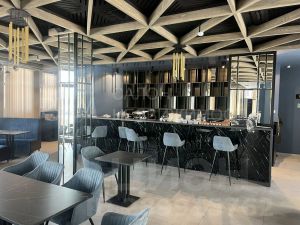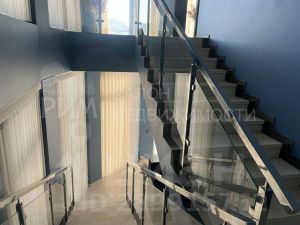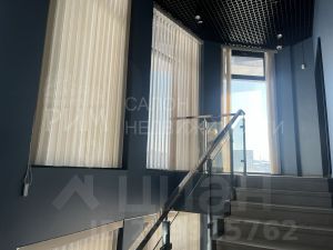 Высокие потолки и витражное остекление.
