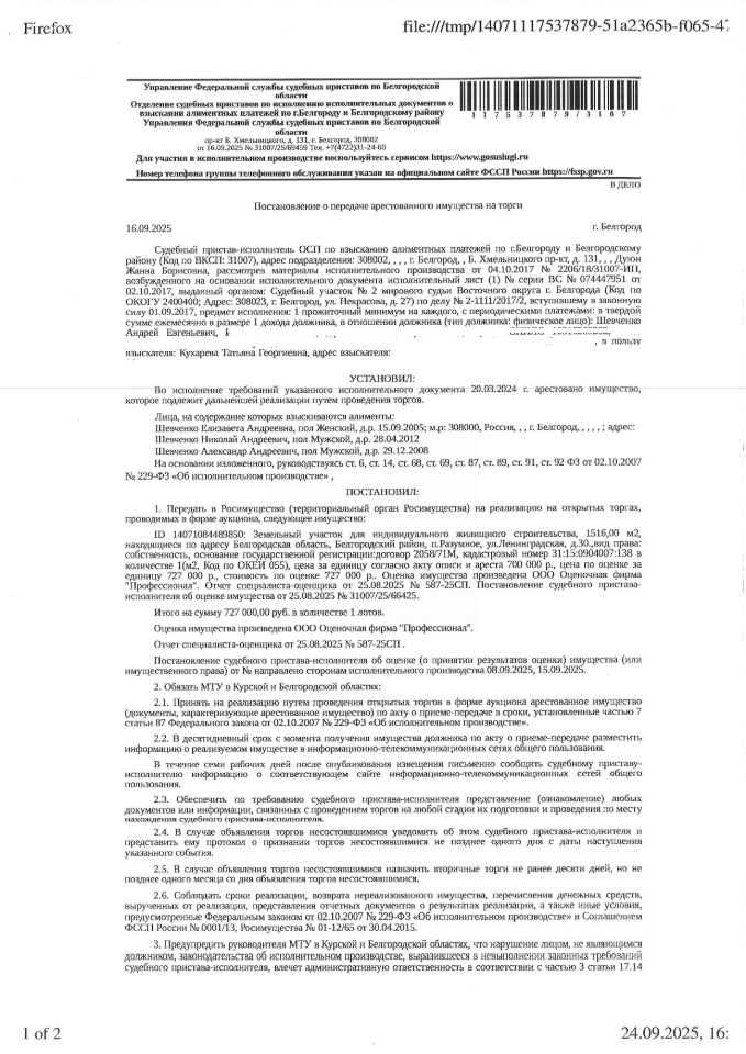 Имущество обременено: арест, запрещение регистрации, ипотека. Первичные торги. Адрес: Белгородская обл., Белгородский р-н, п. Разумное, ул. Ленинградская, д. 30. Собственник: Шевченко А.Е. Залогодержатель: АО "БИК". Взыскатель: Кухарева Т.Г. Внимание! Залогодержатель не является взыскателем. Согласно ст. 353 ГК РФ залог (ипотека) сохраняется (переходит на нового собственника). Основание реализации решение суда: Белгородский районный суд 2-2412/2024 от 20.09.2024 Судебный пристав Дуюн Ж.Б., ОСП по ВАП по г. Белгороду и Белгородскому району, тел. 8 (920) 557-74-84, 8 (920) 568-74-84