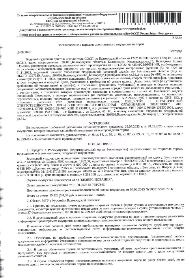 Имущество обременено: арест, запрещение регистрации, ипотека. Первичные торги. Адрес: Белгородская обл., г. Белгород, ул. Щорса, д. 45ж. Собственник: ООО Производственно-строительная организация "Белплекс". Залогодержатель: ПАО АКБ "Кредит-Москва". Взыскатель: УФНС России по Белгородской области. Основание реализации решение суда: Арбитражный суд Белгородской области А08-10833/2023 от 09.12.2024 Судебный пристав Баландина И.Ю., СОСП по Белгородской области, тел. 8 (4722) 73-24-93, 8 (980) 378-24-37