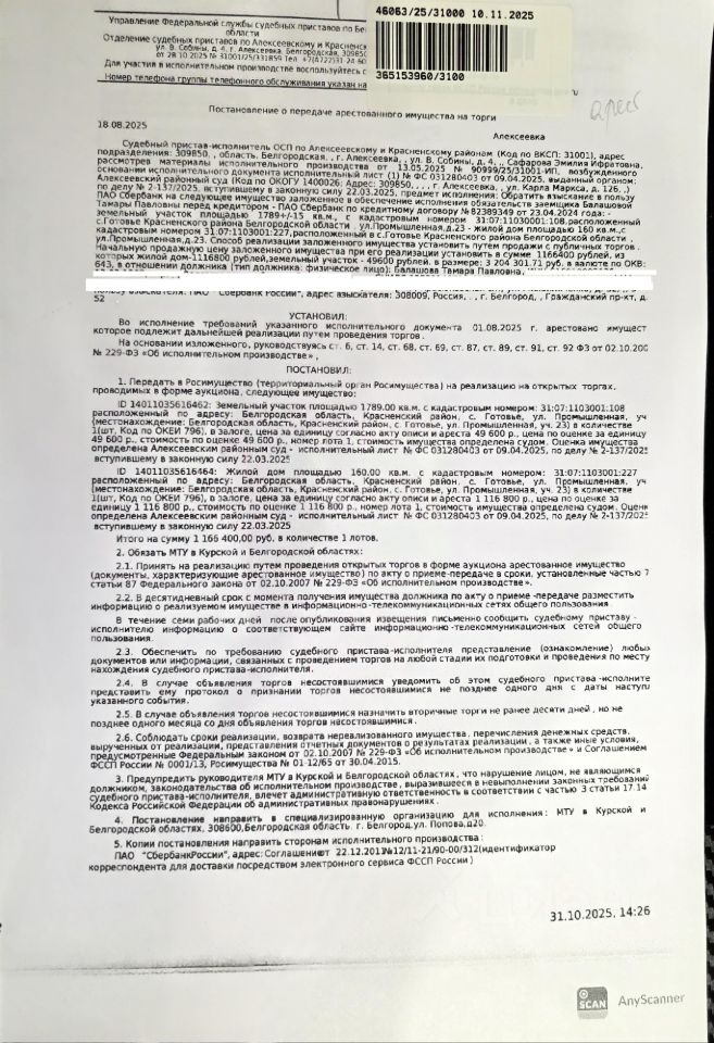 Имущество обременено: арест, запрещение регистрации, ипотека. Первичные торги. Адрес: Белгородская обл., Красненский р-н, с. Готовье, ул. Промышленная, д. 23. Собственник: Балашова Т.П. Залогодержатель: ПАО "Сбербанк". Взыскатель: ПАО "Сбербанк". Основание реализации исполнительный лист: Алексеевский районный суд 2-137/2025 от 21.02.2025 Судебный пристав Сафарова Э.И., ОСП по Алексеевскому и Красненскому районам, тел. 8 (47234) 4-07-59, 8 (47234) 4-12-91