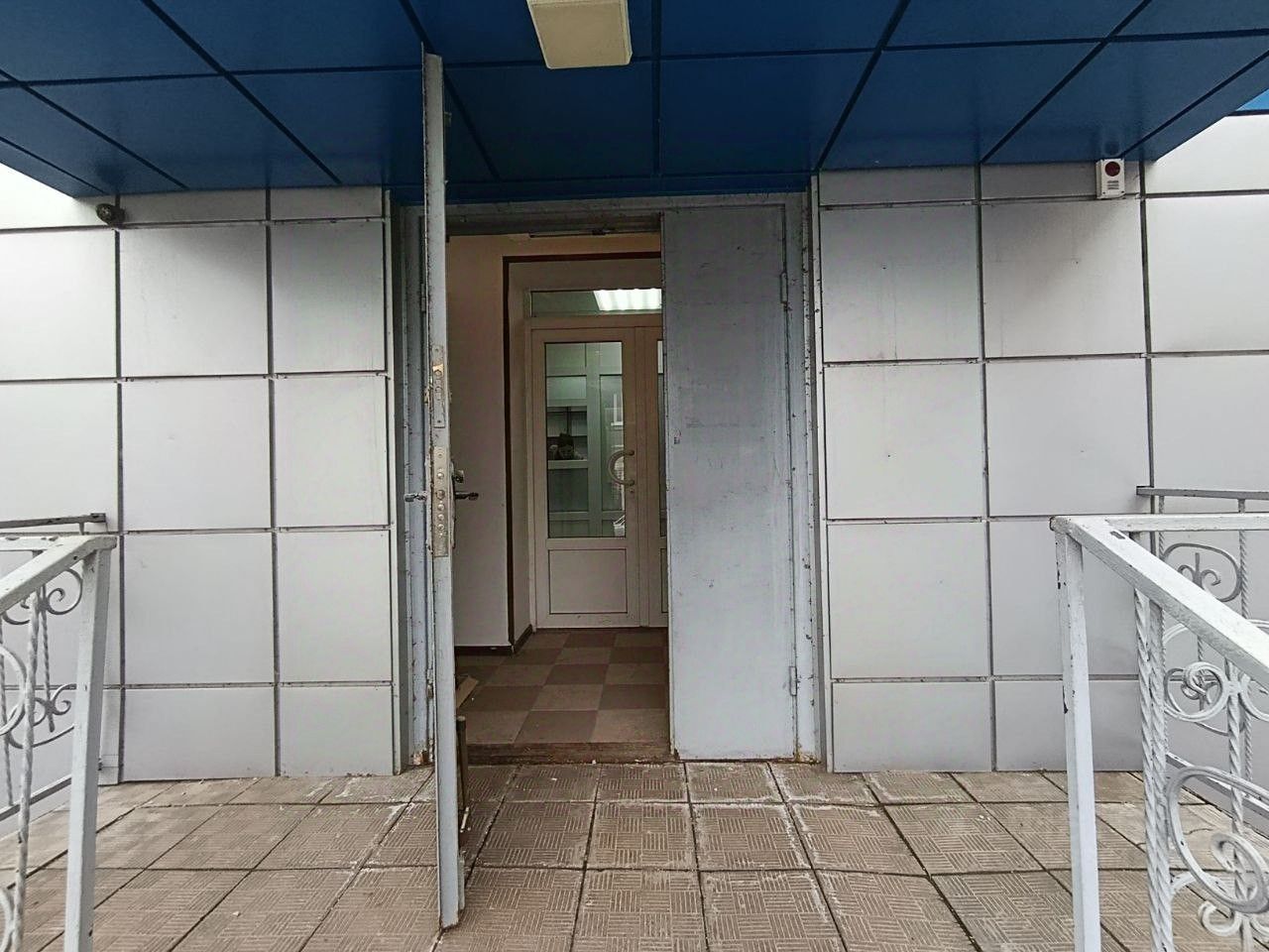Отдельный высокий вход с крыльцом и навесом под рекламу.