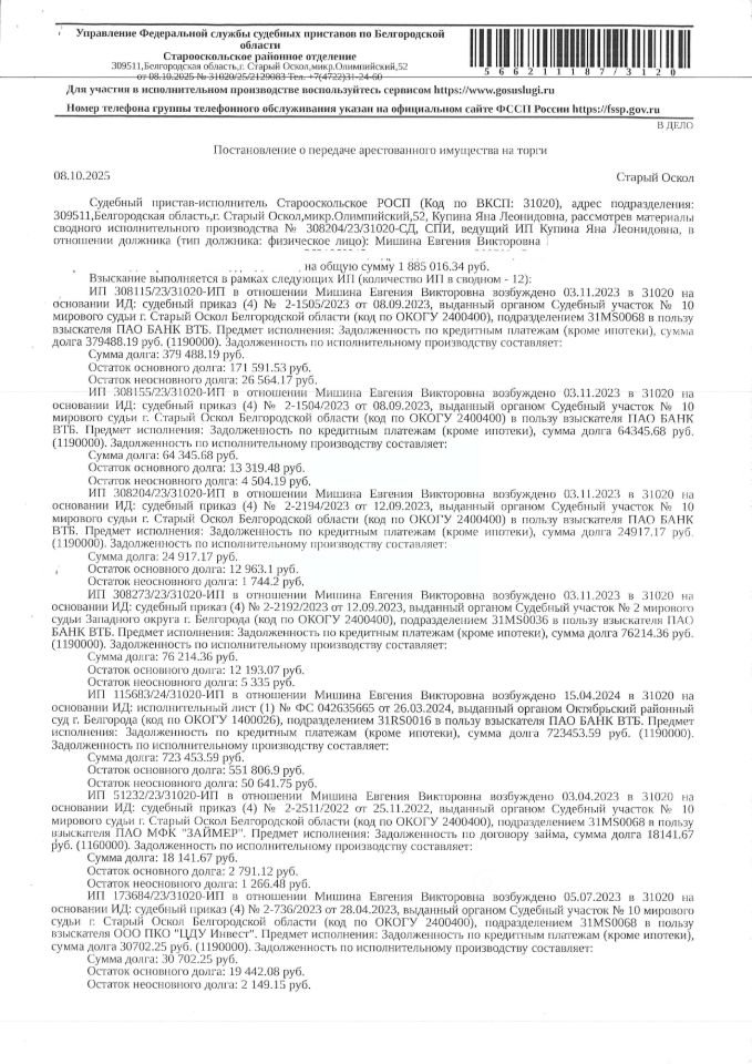 Нежилое помещение площадью 21,6 кв. м, кадастровый номер 31:06:0220017:87. Земельный участок площадью 23 кв. м, кадастровый номер 31:06:0220017:55. Имущество обременено: арест, запрещение регистрации. Имущество принадлежит на праве собственности Мишиной Е.В. Основание реализации: постановление о передаче арестованного имущества на торги от 08.10.2025 31020/25/2129083 Старооскольское РОСП