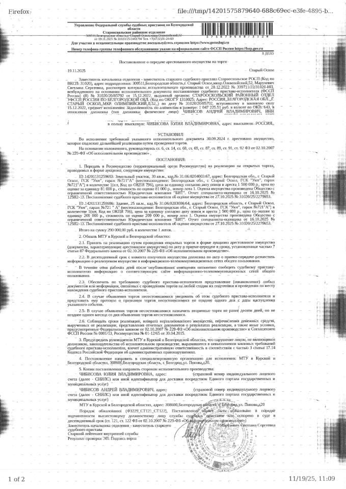 Земельный участок площадью 30 кв. м, кадастровый номер 31:06:0204003:67. Нежилое здание (гараж) площадью 25 кв. м, кадастровый номер 31:06:0203006:64. Имущество обременено: арест, запрещение регистрации. Имущество принадлежит на праве собственности Чибисову А.В. Основание реализации: постановление о передаче на реализацию арестованного имущества на торги от 19.11.2025 31020/25/2461794 Старооскольское РОСП