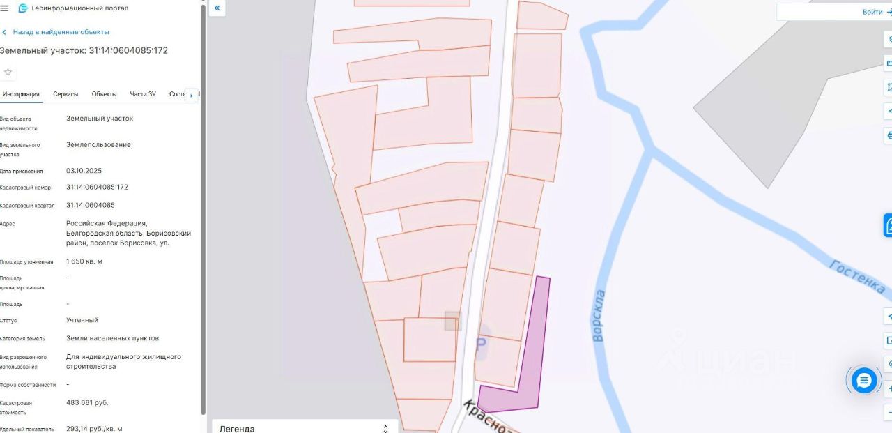 земельный участок из категории земель - "земли населенных пунктов", с видом разрешенного использования для индивидуального жилищного строительства, площадью 1650 кв. м., кадастровый номер 31:14:0604085:172, расположенного по адресу: Белгородская область, район Борисовский, п. Борисовка, ул. Песчаная, 2/1