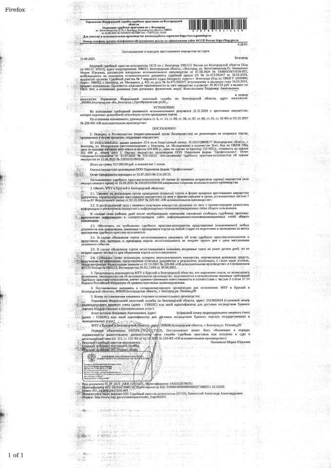Нежилое здание (гараж) площадью 25,6 кв. м, кадастровый номер 31:16:0126008:77. Имущество обременено: арест, запрещение регистрации. Имущество принадлежит на праве собственности Константинову В.А. Основание реализации: постановление о передаче арестованного имущества на торги от 12.09.2025 31010/25/1037660 ОСП по г. Белгороду