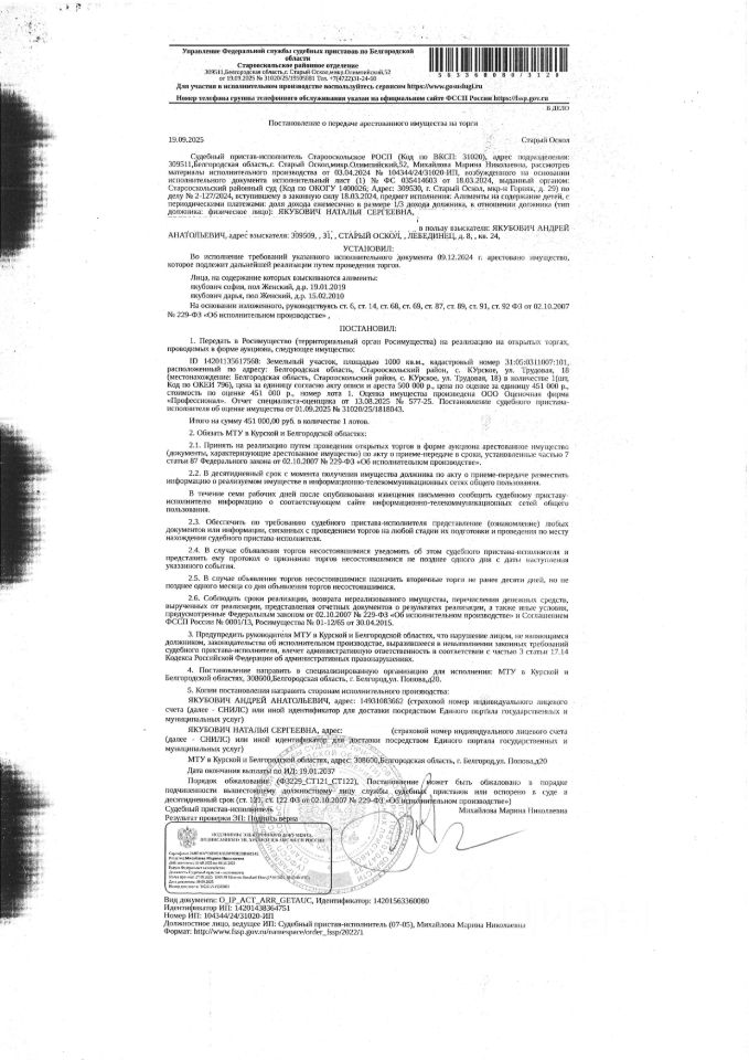 Земельный участок площадью 1000 кв. м, кадастровый номер 31:05:0311007:101. Имущество обременено: арест, запрещение регистрации. Имущество принадлежит на праве собственности Якубович Н.С. Основание реализации: постановление о передаче арестованного имущества на торги от 19.09.2025 31020/25/19505881 Старооскольского РОСП