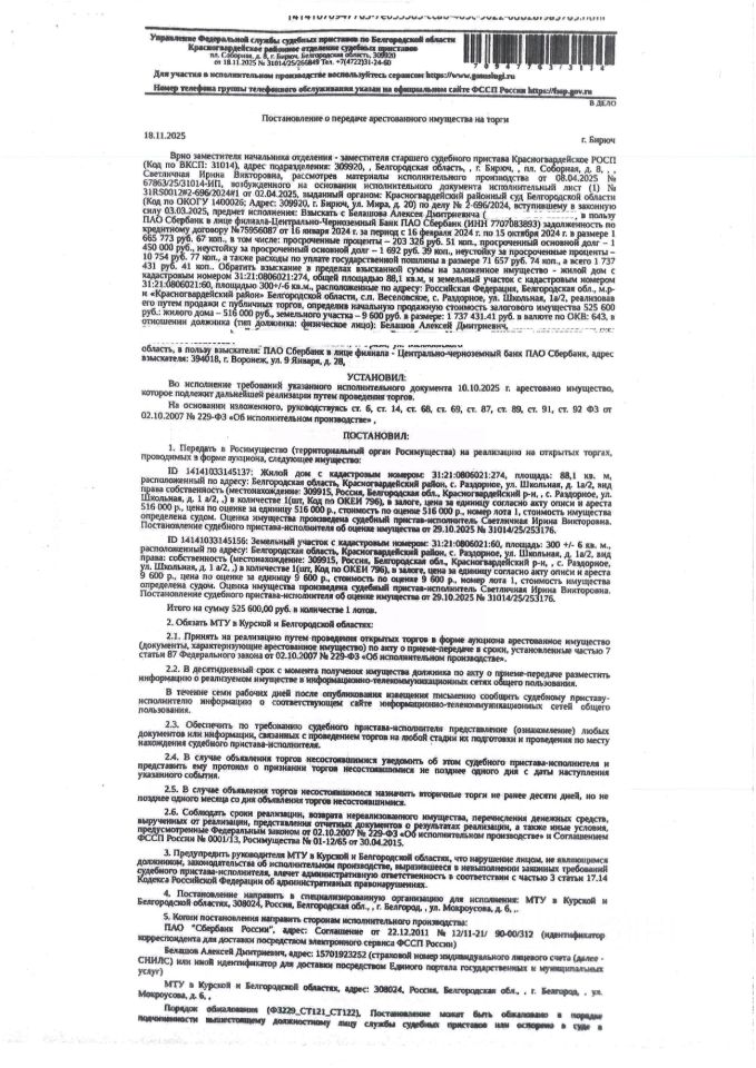 Имущество обременено: арест, запрещение регистрации, ипотека. Первичные торги. Адрес: Белгородская обл., Красногвардейский р-н, с.п. Веселовское, с. Раздорное, ул. Школьная, 1а/2. Собственник: Белашов А.Д. Залогодержатель: ПАО "Сбербанк". Взыскатель: ПАО "Сбербанк". Основание реализации исполнительный лист: Красногвардейский районный суд 2-696/2024 от 18.12.2024 Судебный пристав Светличная И.В., Красногвардейское РОСП, тел. 8 (47247) 3-12-01