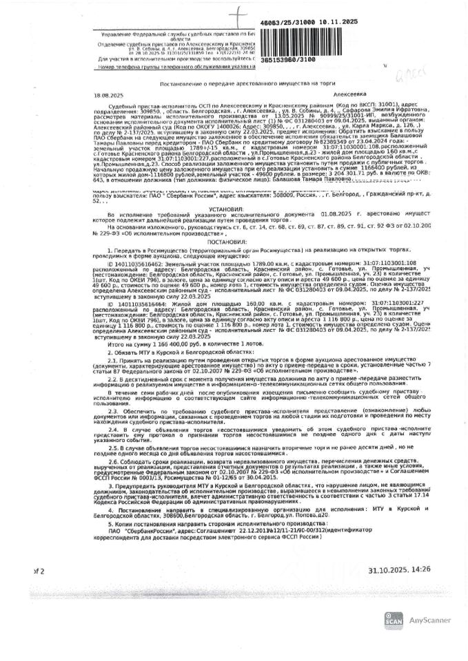 Имущество обременено: арест, запрещение регистрации, ипотека. Первичные торги. Адрес: Белгородская обл., Красненский р-н, с. Готовье, ул. Промышленная, д. 23. Собственник: Балашова Т.П. Залогодержатель: ПАО "Сбербанк". Взыскатель: ПАО "Сбербанк". Основание реализации исполнительный лист: Алексеевский районный суд 2-137/2025 от 21.02.2025 Судебный пристав Сафарова Э.И., ОСП по Алексеевскому и Красненскому районам, тел. 8 (47234) 4-07-59, 8 (47234) 4-12-91
