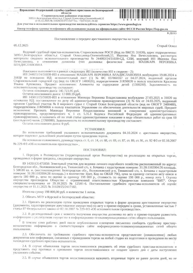 Земельный участок площадью 5500 кв. м, кадастровый номер 31:20:1102004:26. Имущество обременено: арест, запрещение регистрации. Граница земельного участка не установлена. Имущество принадлежит на праве собственности Машкара В.В. Основание реализации: постановление о передаче арестованного имущества на торги от 05.12.2025 31020/25/272721547 Старооскольского РОСП Обращаем внимание, что в соответствии со вступлением в силу изменений в Федеральный закон от 13.07.2015 218-ФЗ, внесенные Федеральным законом от 26.12.2024 487-ФЗ, для государственной регистрации прав требуется произвести межевание земельного участка