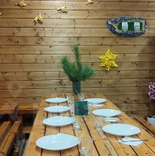 помещение 55кв (внутри кухня с посудой, стол, чайник, холодильник, микроволновая печь,туалет,душ,баня на дровах), на улице навес стол, мангал,чан, гамак, качели.