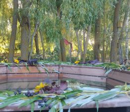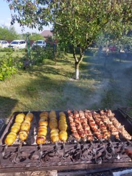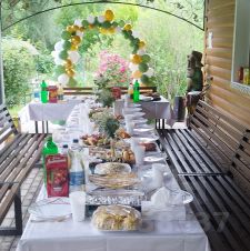 закрытая отапливаемая беседка 20кв ( круглогодичная), внутри кухня с посудой, стол, микроволновая печь, диванчик , на улице стол с лавочками, мангал, гамак, качели.