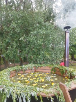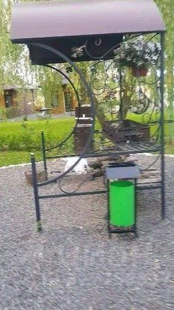 Отдельно стоит открытая деревянная беседка посадка до 30 человек, мангал с навесом, рукомойник.
