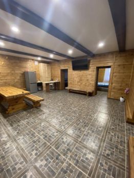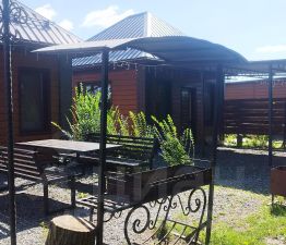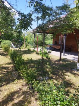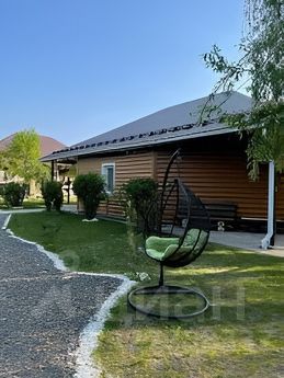 гостевой дом площадью 90м2 (внутри банкетный зал, холодильник, чайник, микроволновая печь, две спальни, телевизоры, баня на дровах, туалет, душ, отопление в доме газовое) на улице терраса, столы, мангал с навесом (посадка до 40 человек), качели, гамак,