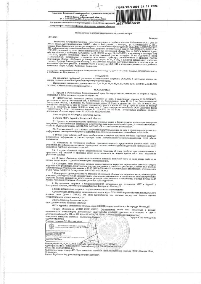Земельный участок площадью 27 кв. м, кадастровый номер 31:18:0701036:39. Имущество обременено: арест, запрещение регистрации. Имущество принадлежит на праве собственности Супруну А.В. Основание реализации: постановление о передаче арестованного имущества на торги от 18.11.2025 31022/25/960838 Шебекинское РОСП
