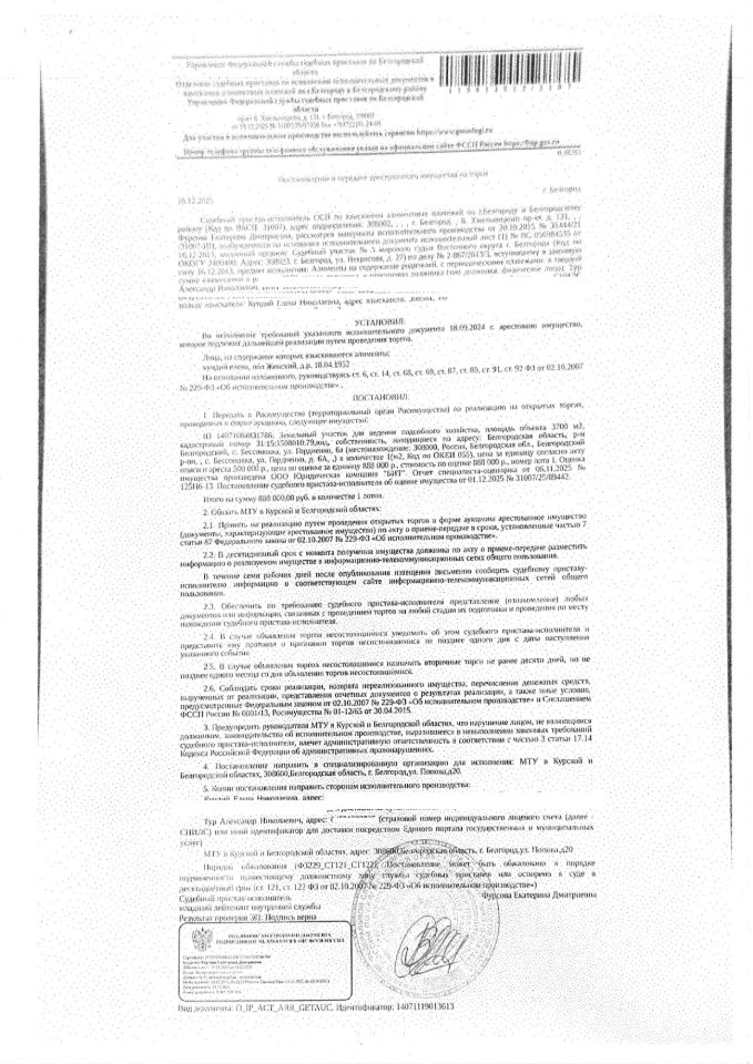 Земельный участок площадью 3700 кв. м, кадастровый номер 31:15:1508010:79. Имущество обременено: арест, запрещение регистрации. Имущество принадлежит на праве собственности Тур А.Н. Основание реализации: постановление о передаче арестованного имущества на торги от 19.12.2025 ОСП по взысканию алиментных платежей по г. Белгороду и Белгородскому району