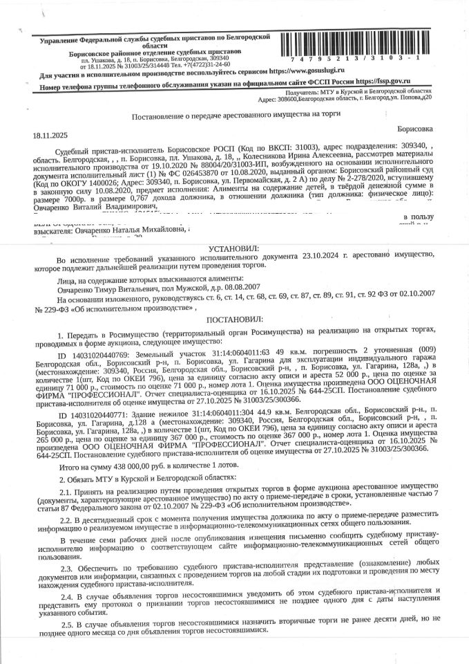 Земельный участок площадью 49 кв. м, кадастровый номер 31:14:0604011:63. Нежилое здание площадью 44,9 кв. м, кадастровый номер 31:14:0604011:304. Имущество обременено: арест, запрещение регистрации. Имущество принадлежит на праве собственности Овчаренко В.В. Основание реализации: постановление о передаче арестованного имущества на торги от 18.11.2025 31003/25/314448 Борисовское РОСП