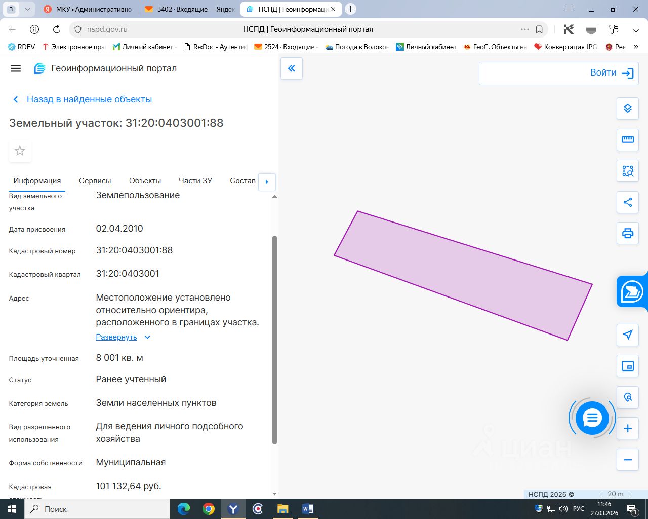 земельный участок из земель населенных пунктов с кадастровым номером 31:20:0403001:88, площадью 8001 кв. м, расположенный по адресу: Белгородская область, Волоконовский район, с. Покровка (зона садоводства, огородничества и дачного хозяйства СХ101) разрешенное использование для ведения личного подсобного хозяйства