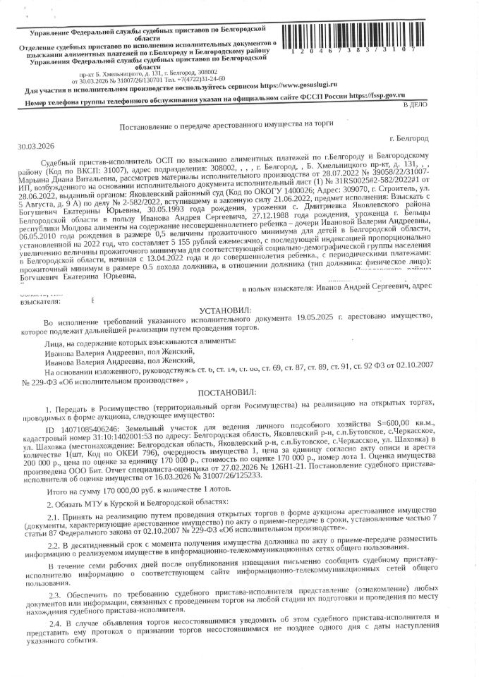 Земельный участок площадью 600 кв. м, кадастровый номер 31:10:1402001:53. Имущество обременено: арест, запрещение регистрации. Имущество принадлежит на праве собственности Богушевич Е.Ю. Основание реализации: постановление о передаче арестованного имущества на торги от 30.03.2026 31007/26/130701 ОСП по взысканию алиментных платежей по г. Белгороду и Белгородскому району