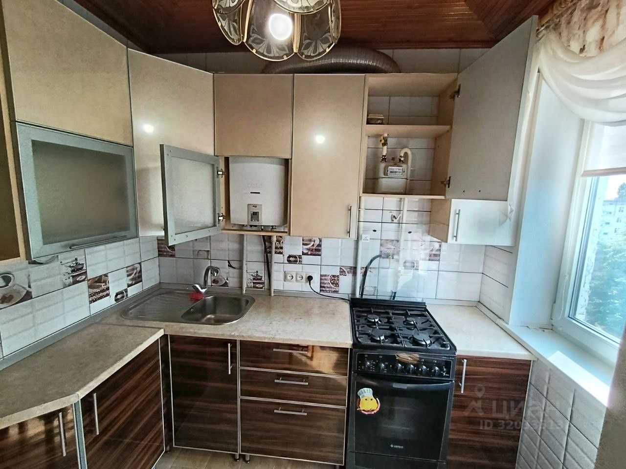 Кухня площадью 6 квадратных метров включает встроенный кухонный гарнитур, газовую плиту и газовую водонагревательную колонку фирма "Нева" .