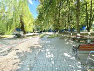 Внутренний дворик большой, весь утопает в зелени, не проездной, есть игровая и детская площадки, зона отдыха и парковка.