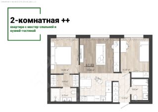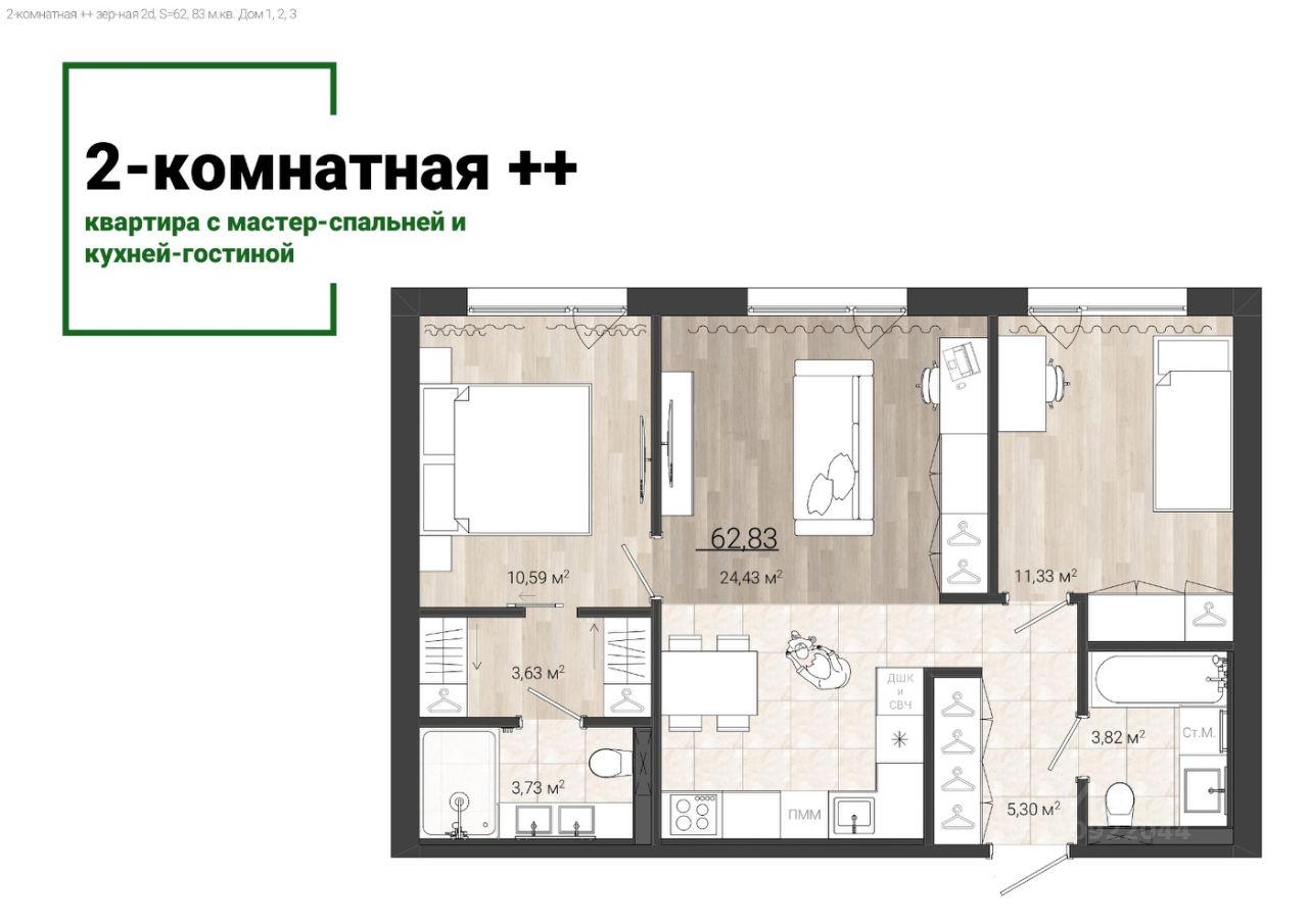 Две светлые и просторные комнаты, каждая из которых предлагает уникальные возможности для организации пространства. Мастер-спальня площадью 10,59 м² и вторая спальня площадью 11,33 м² обеспечат вам идеальные условия для отдыха и сна.