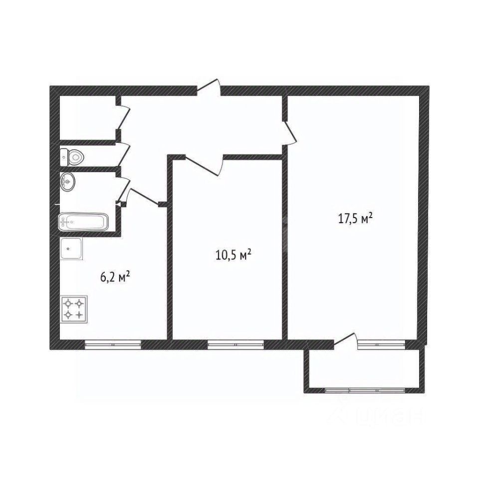 Практичная планировка включает в себя 2 просторные комнат: 17,5 м2 и 10,5 м2, все комнаты изолированные, так же огромный плюс - наличие гардеробной!