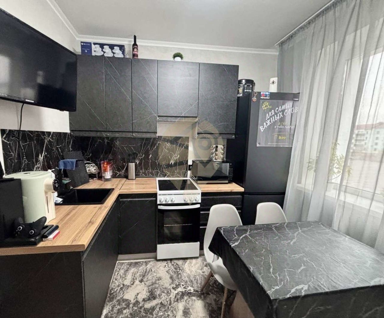 • Кухонный гарнитур с плитой столом и стульями, телевизоры в кухне и комнате, в ванной шкафчики тумбочка и кризина, в зале-стенка, стол, кресло, ковры остаётся при продаже.