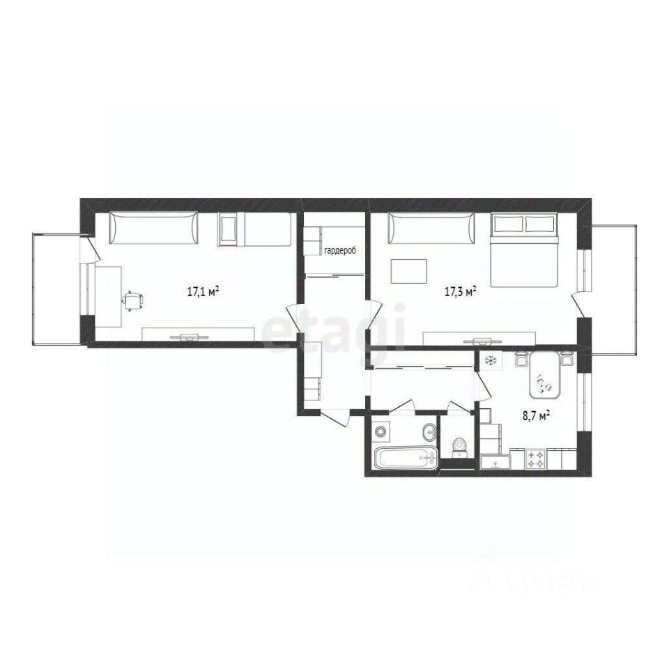 Две просторные комнаты 17,1 и 17,3 м2 каждая имеет выход на за стекленный балкон .