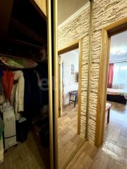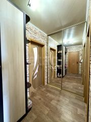 В просторной прихожей сделана удобная гардеробная , оборудована зеркальными дверьми-купе, внутри полочками и штангами.