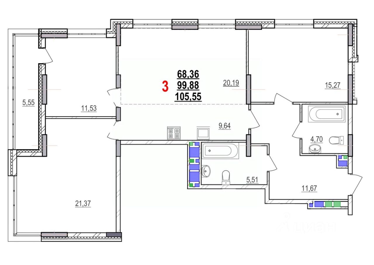 Продаётся 3-комнатная квартира в строящемся доме (Дом 78), срок сдачи: IV-кв. 2026, общей площадью 105.55 кв.м., на 10 этаже. Двухуровневая квартира.