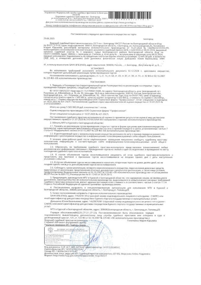 Жилое помещение площадью 56,8 кв. м, кадастровый номер 31:15:1709001:5505. Имущество обременено: арест, запрещение регистрации. Имущество принадлежит на праве собственности Даньшиной Ю.В. Основание реализации: постановление о передаче арестованного имущества на торги от 29.08.2025 31010/25/995071 ОСП по г. Белгороду